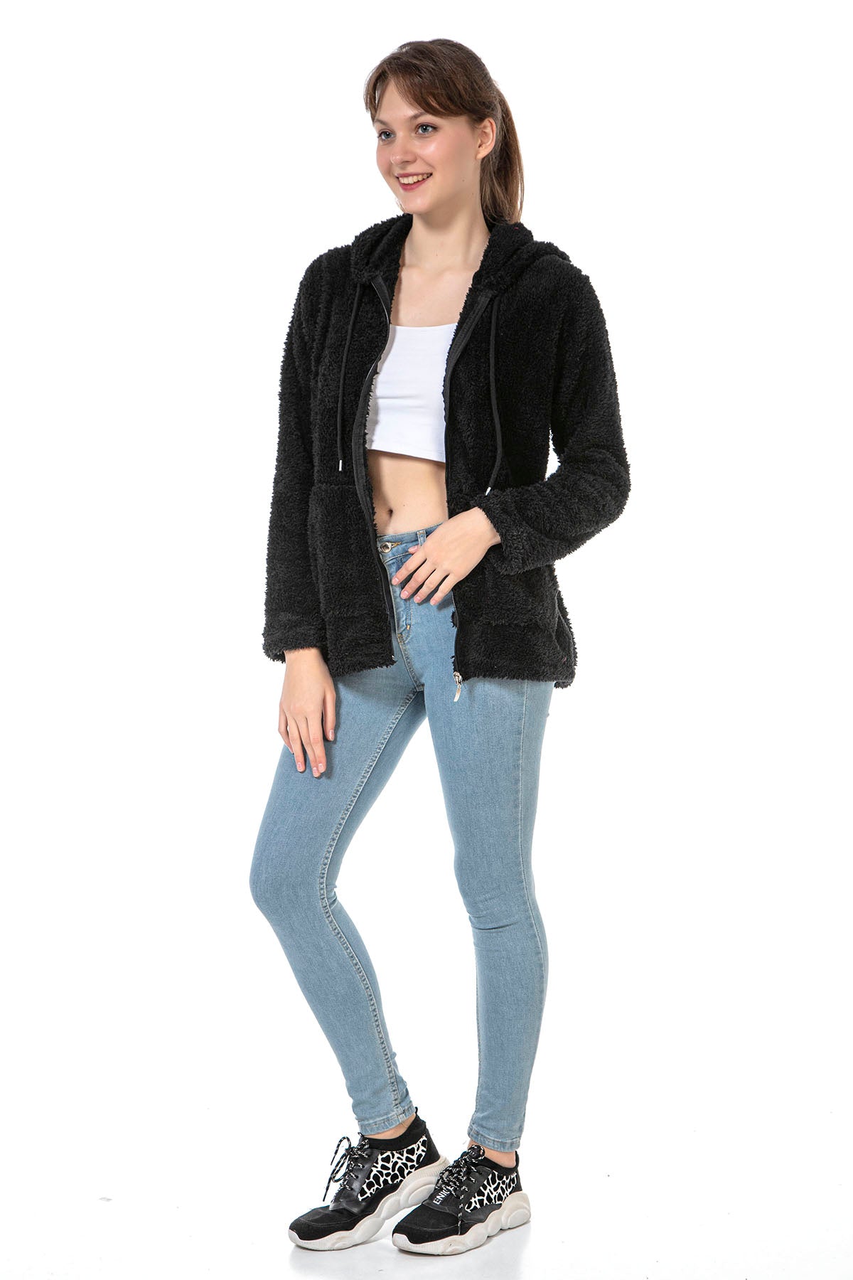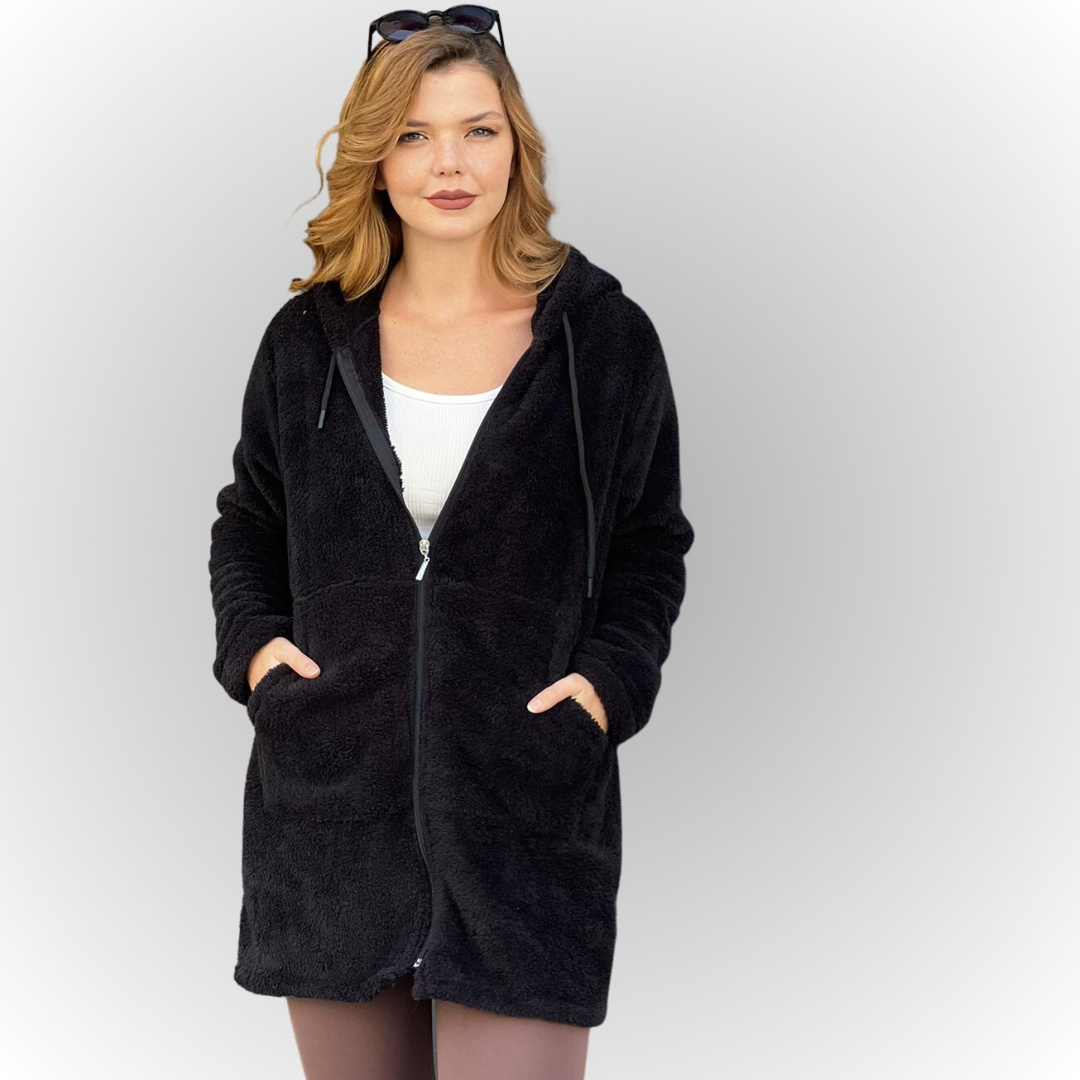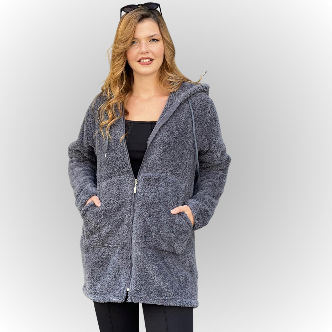 Kadın Füme Kapşonlu Uzun Peluş Ceket