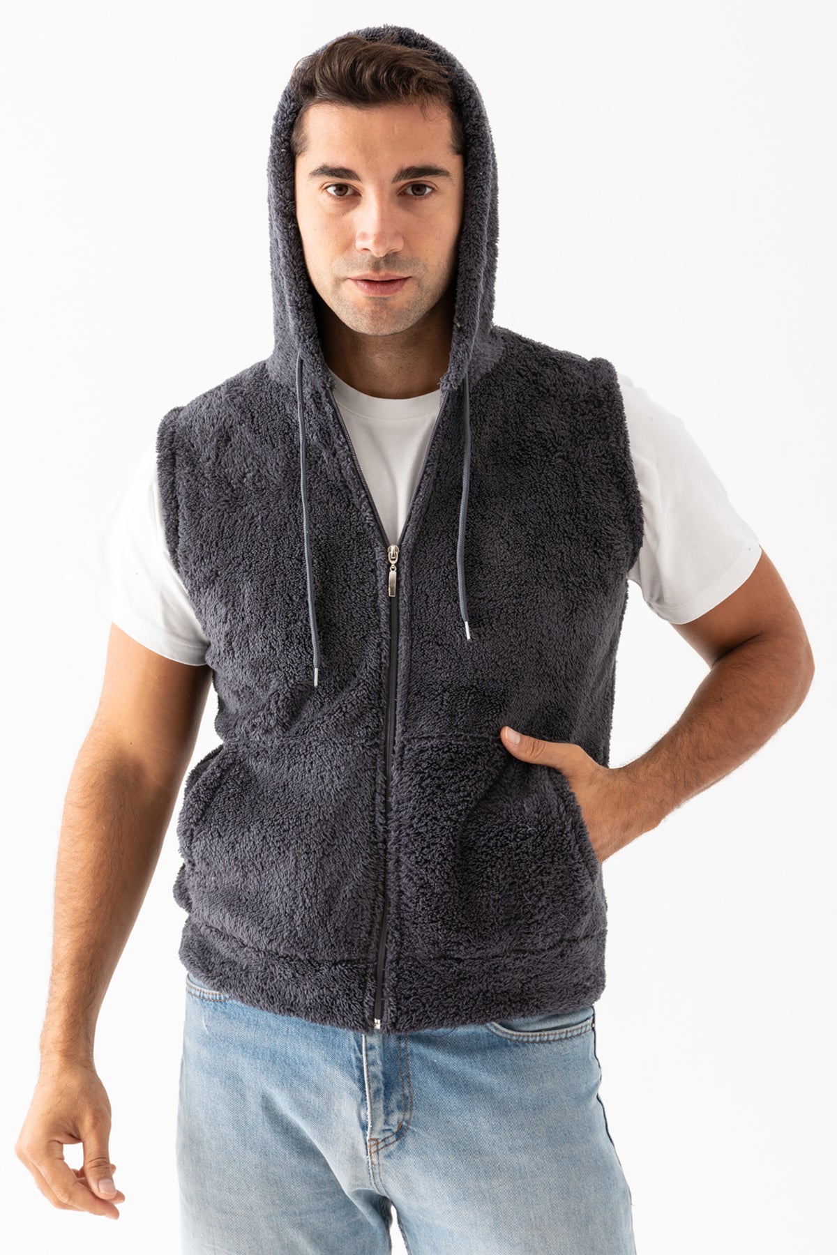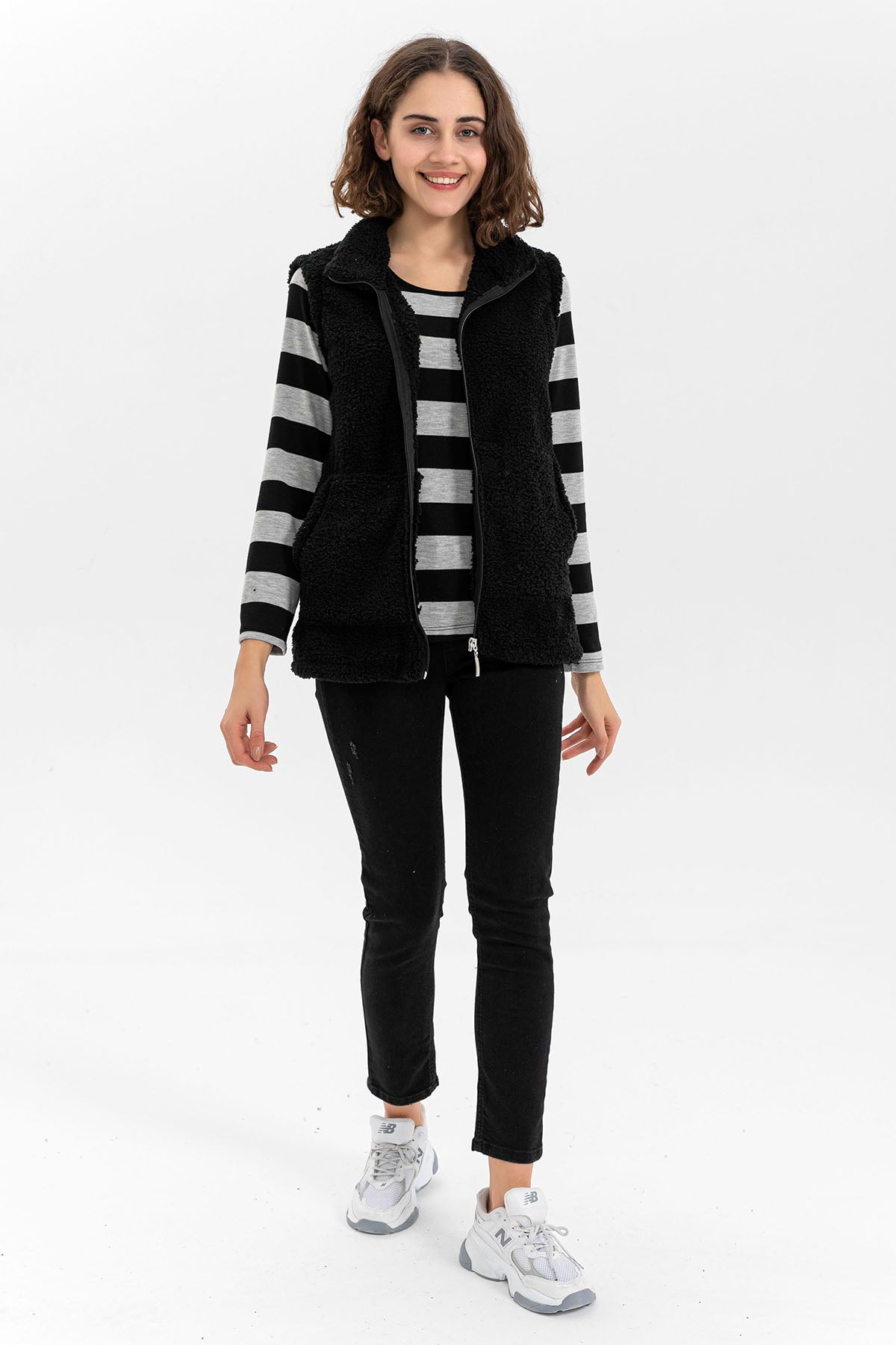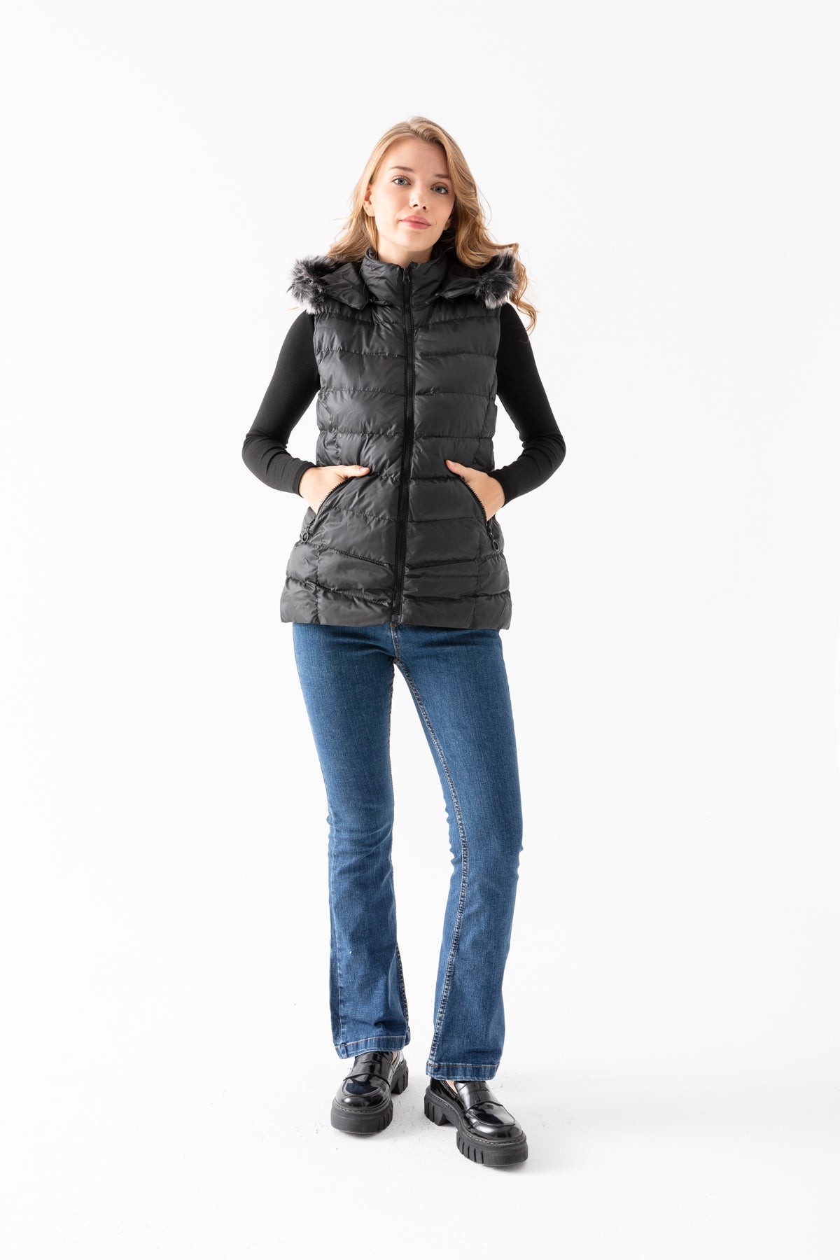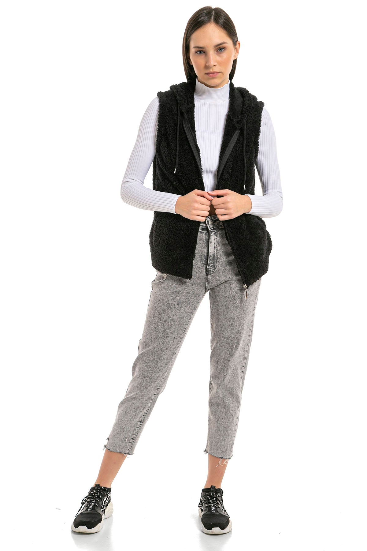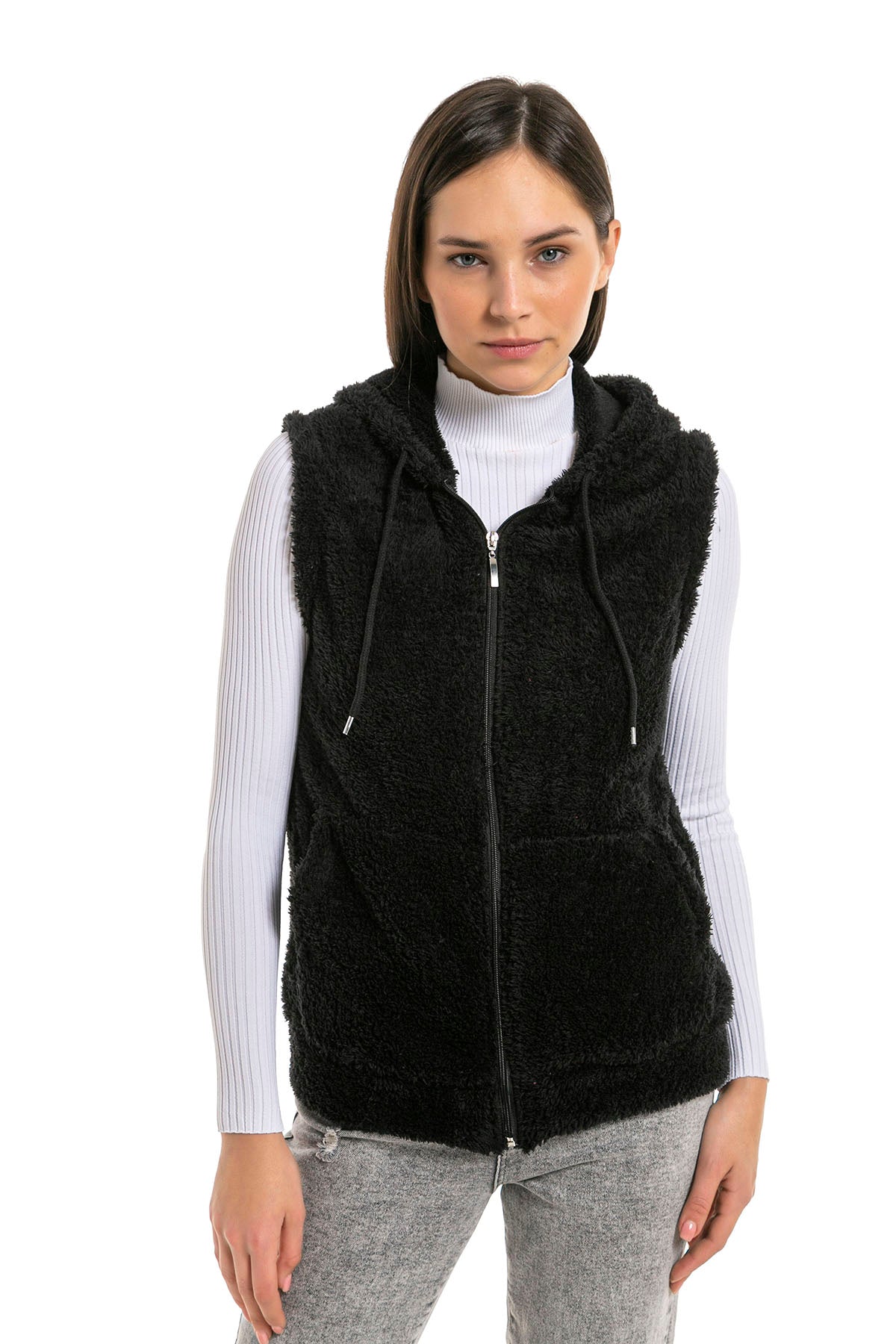 Kadın Siyah Kapşonlu Kolsuz Peluş Yelek