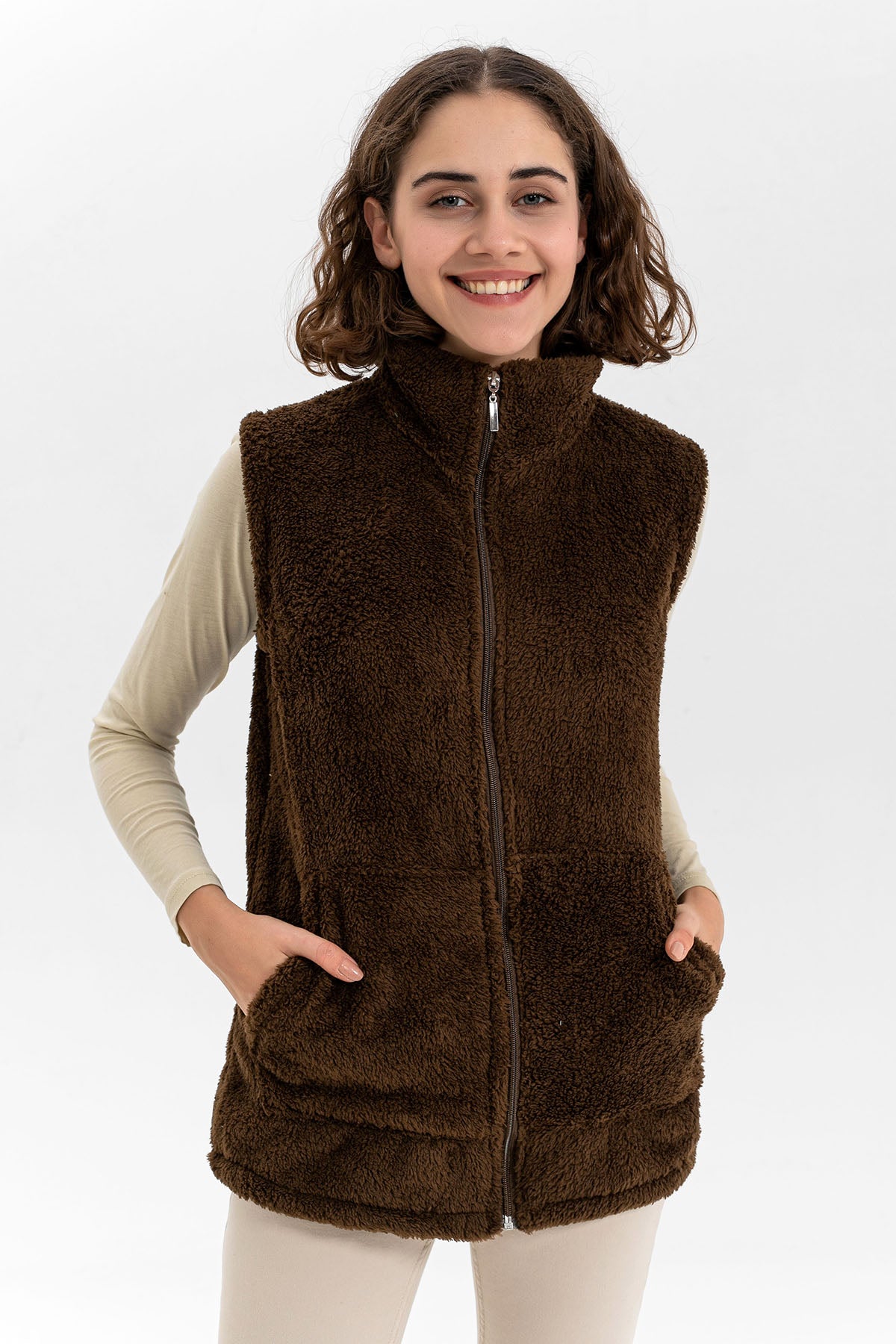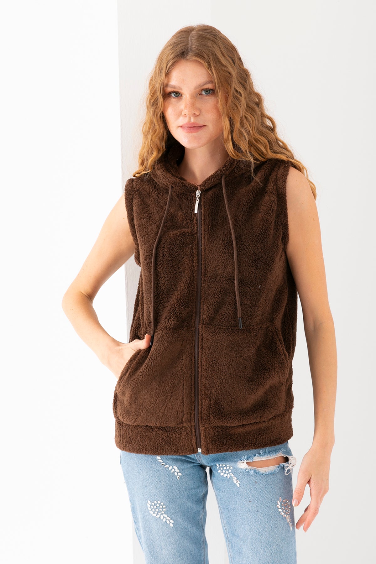 Kadın Kahverengi Kapşonlu Kolsuz Peluş Yelek