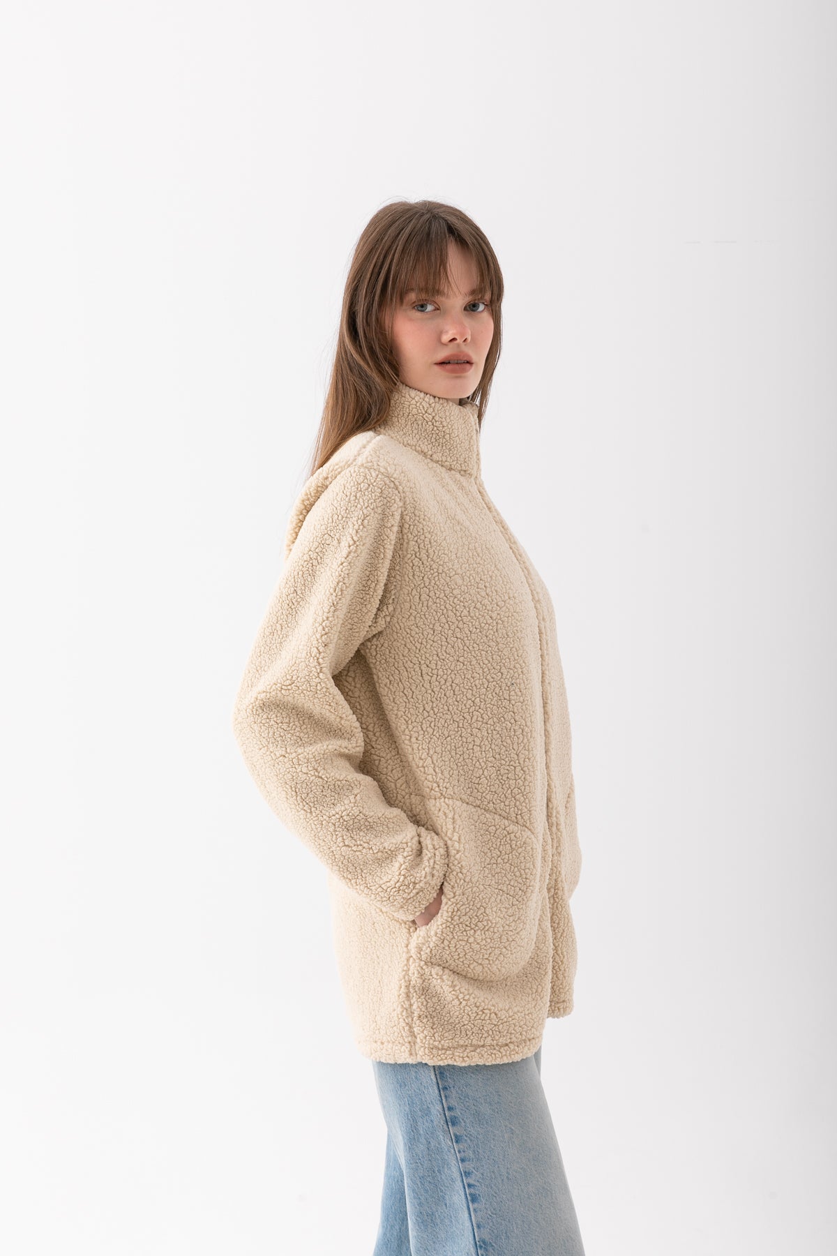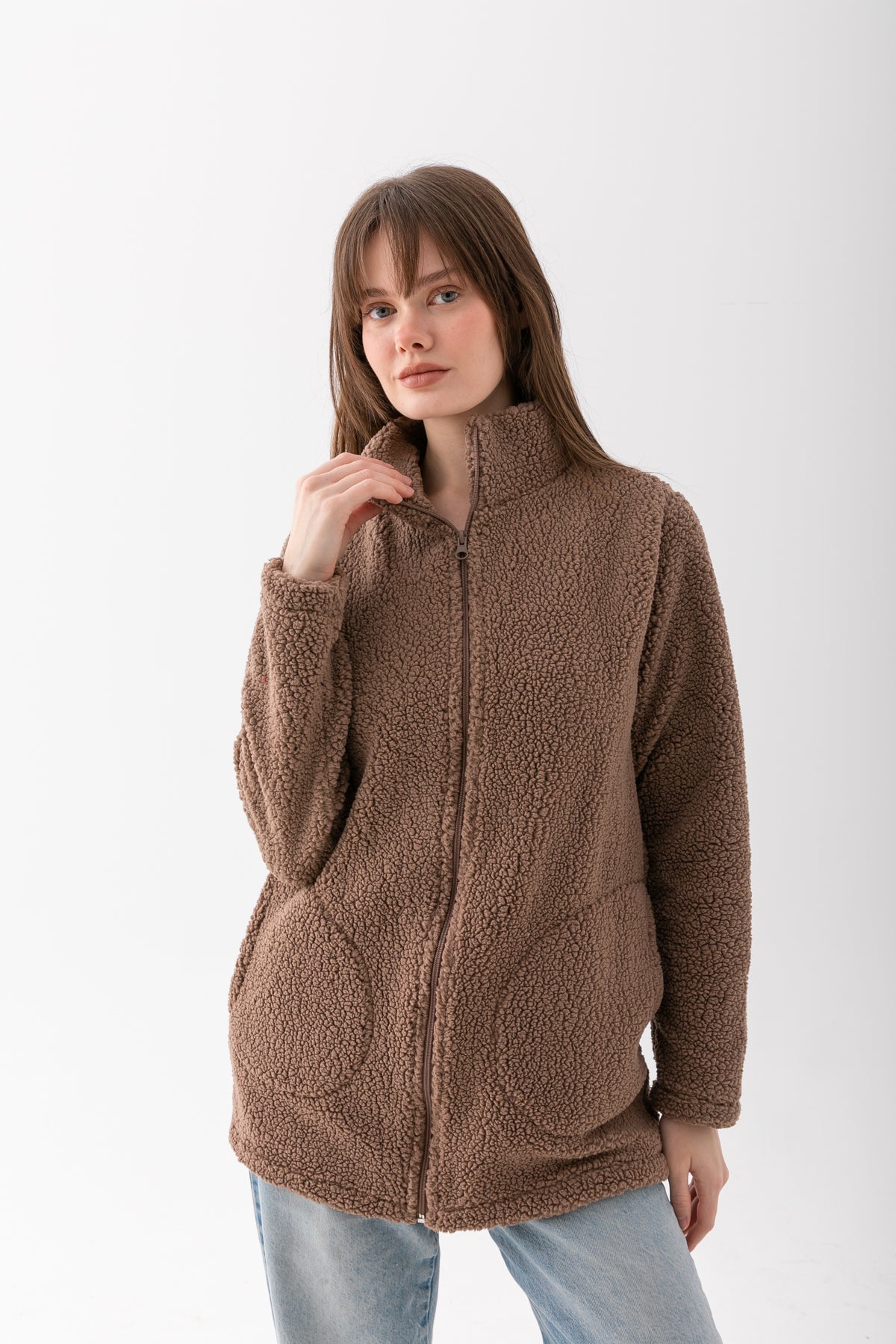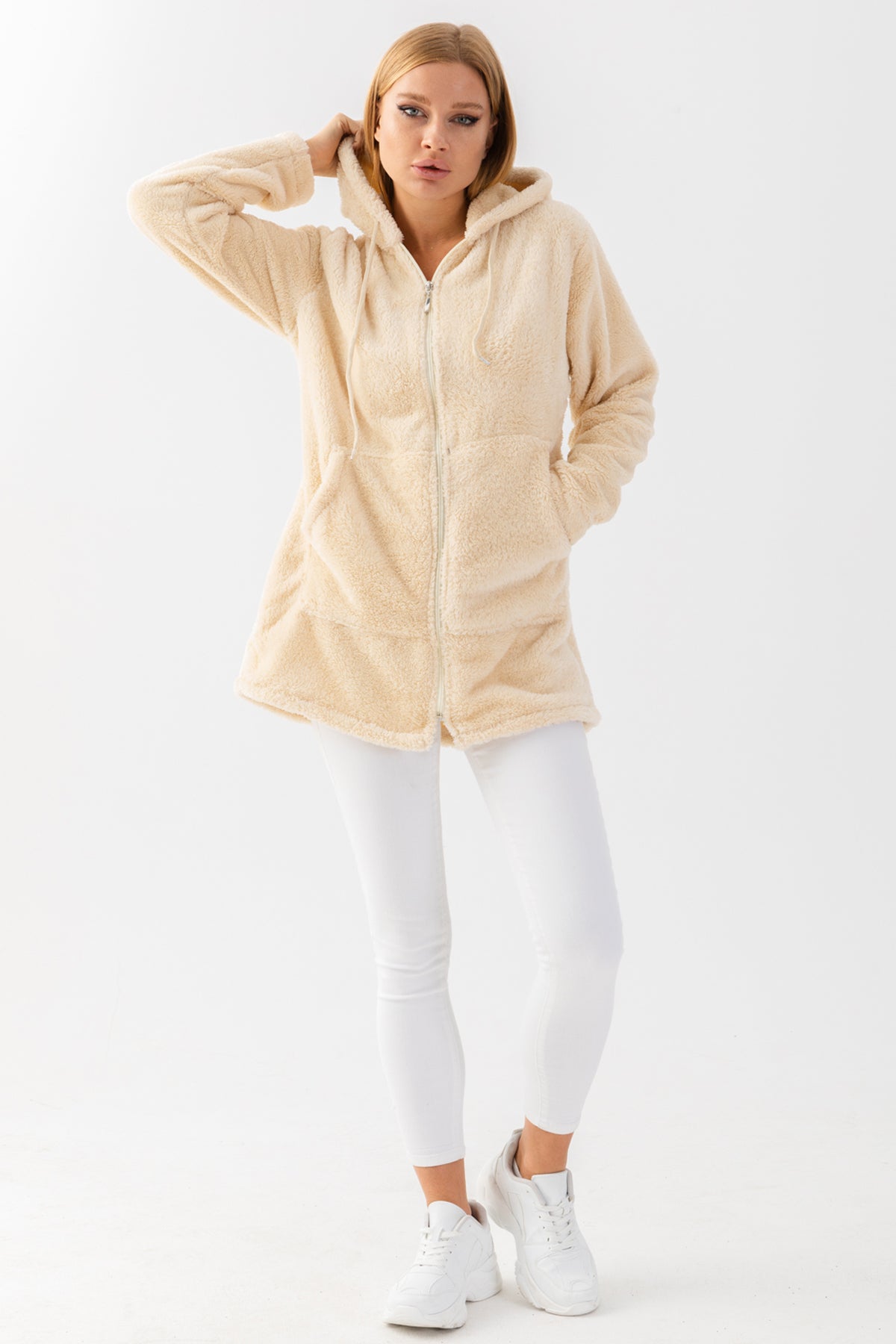 Kadın Koyu Krem Kapşonlu Uzun Peluş Ceket
