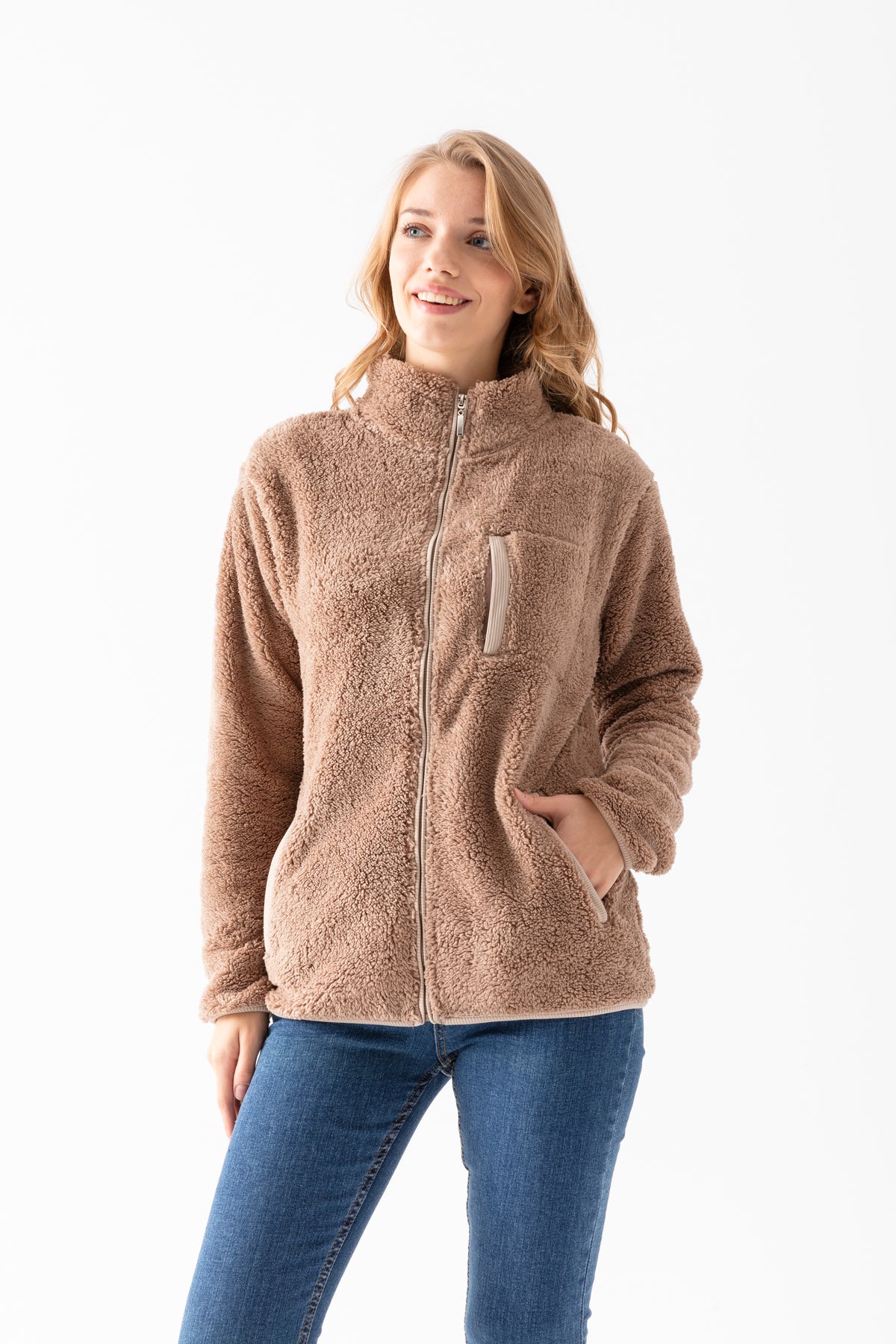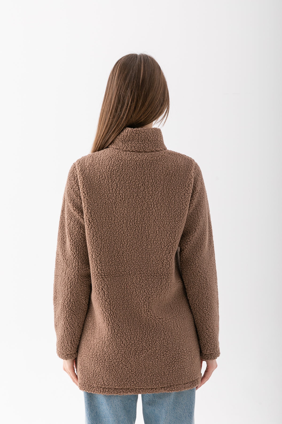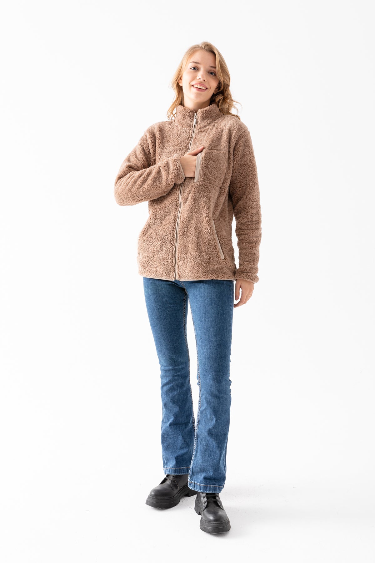 Kadın Koyu Krem Kapşonlu Uzun Peluş Ceket