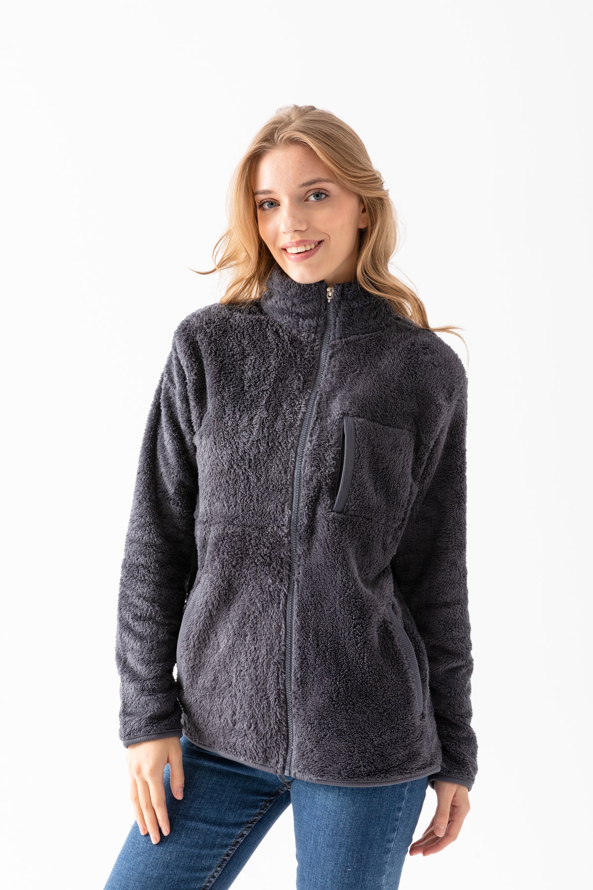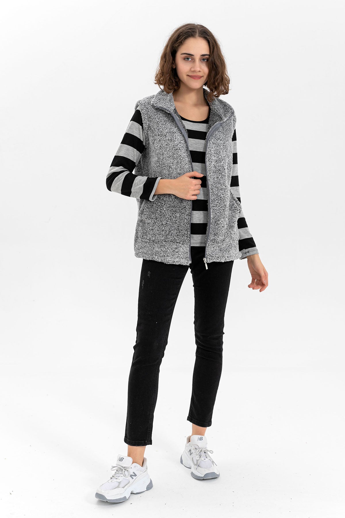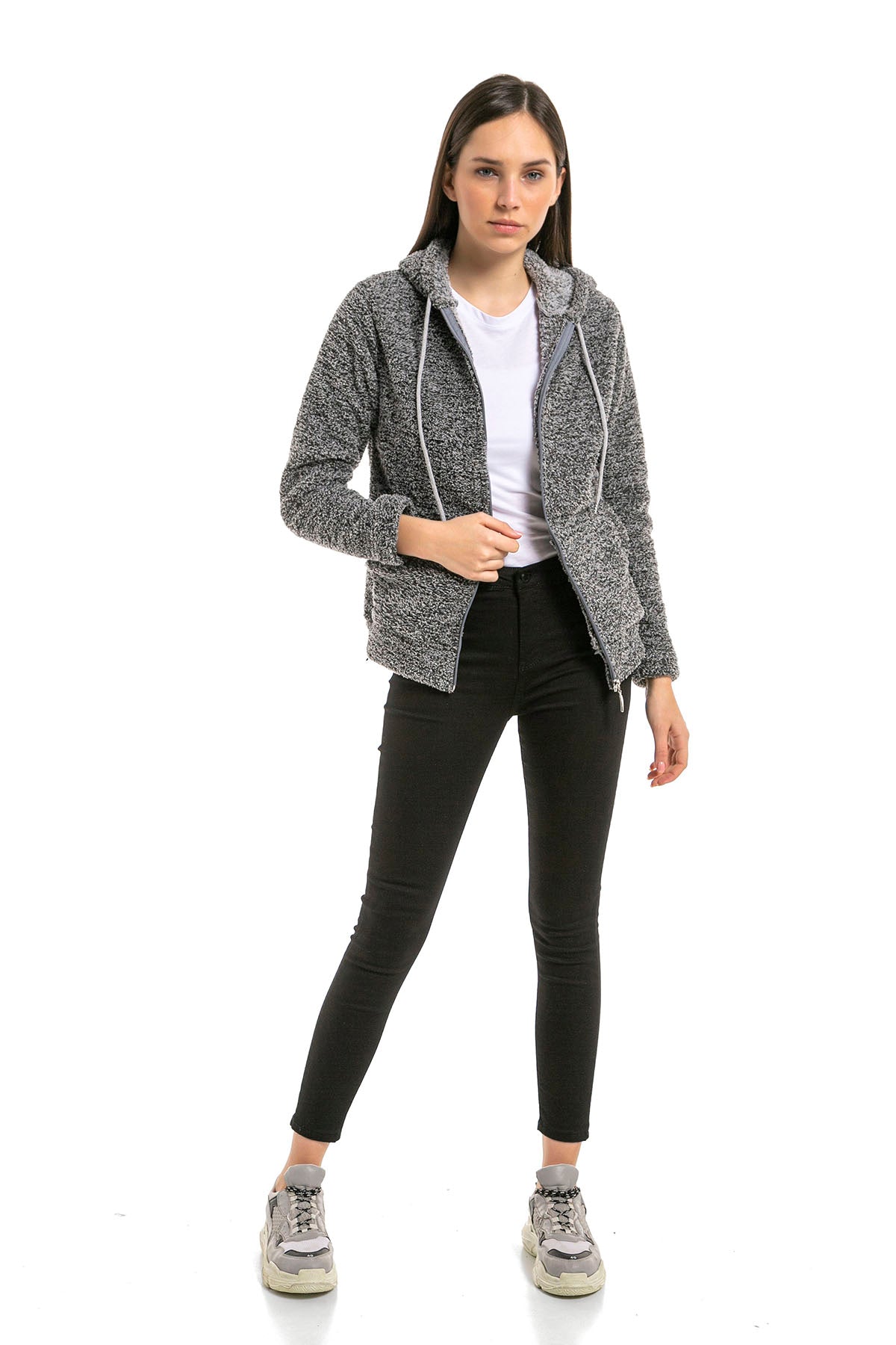 Kadın Kırçıllı Gri Kapüşonlu Peluş Ceket