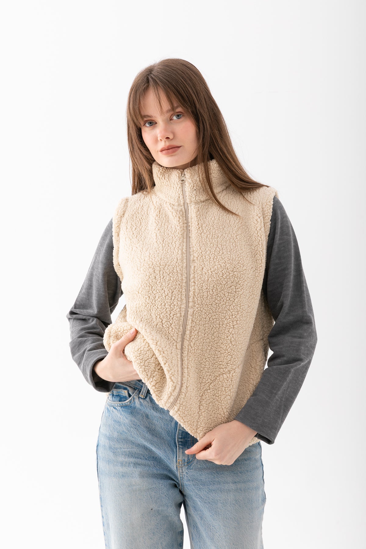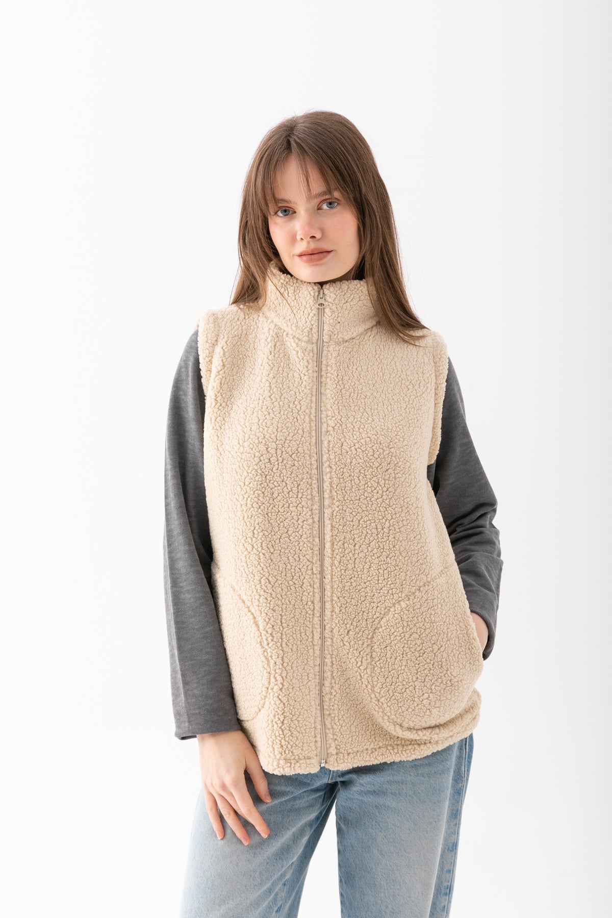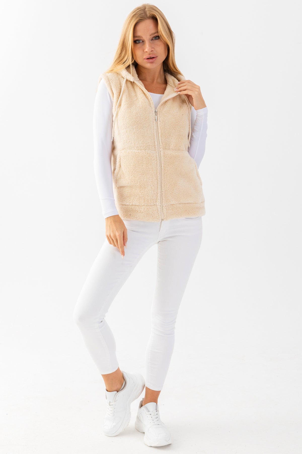 Kadın Ekru Kapşonlu Kolsuz Peluş Yelek
