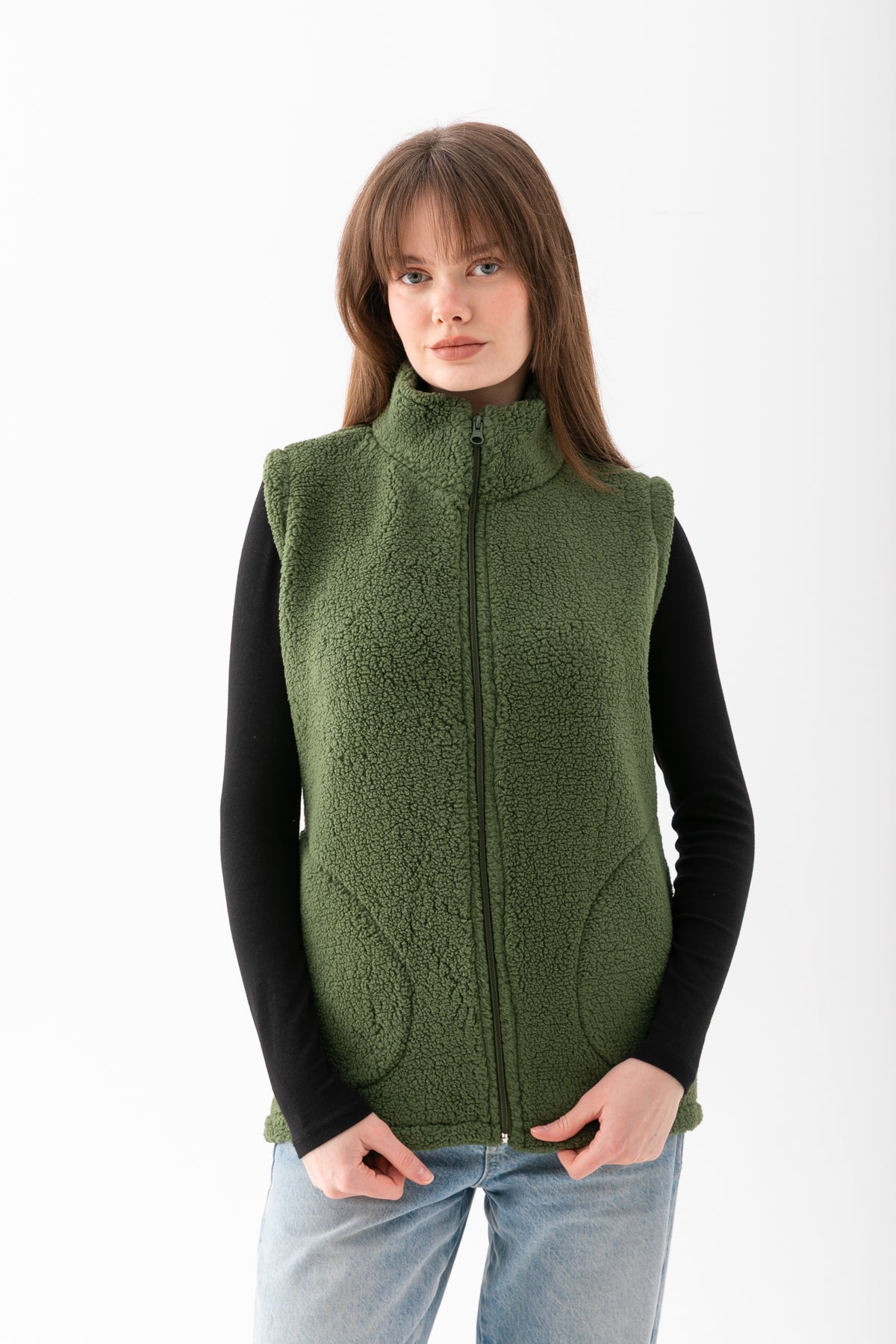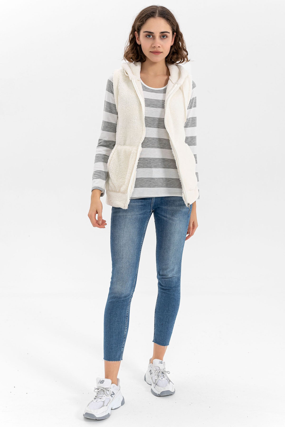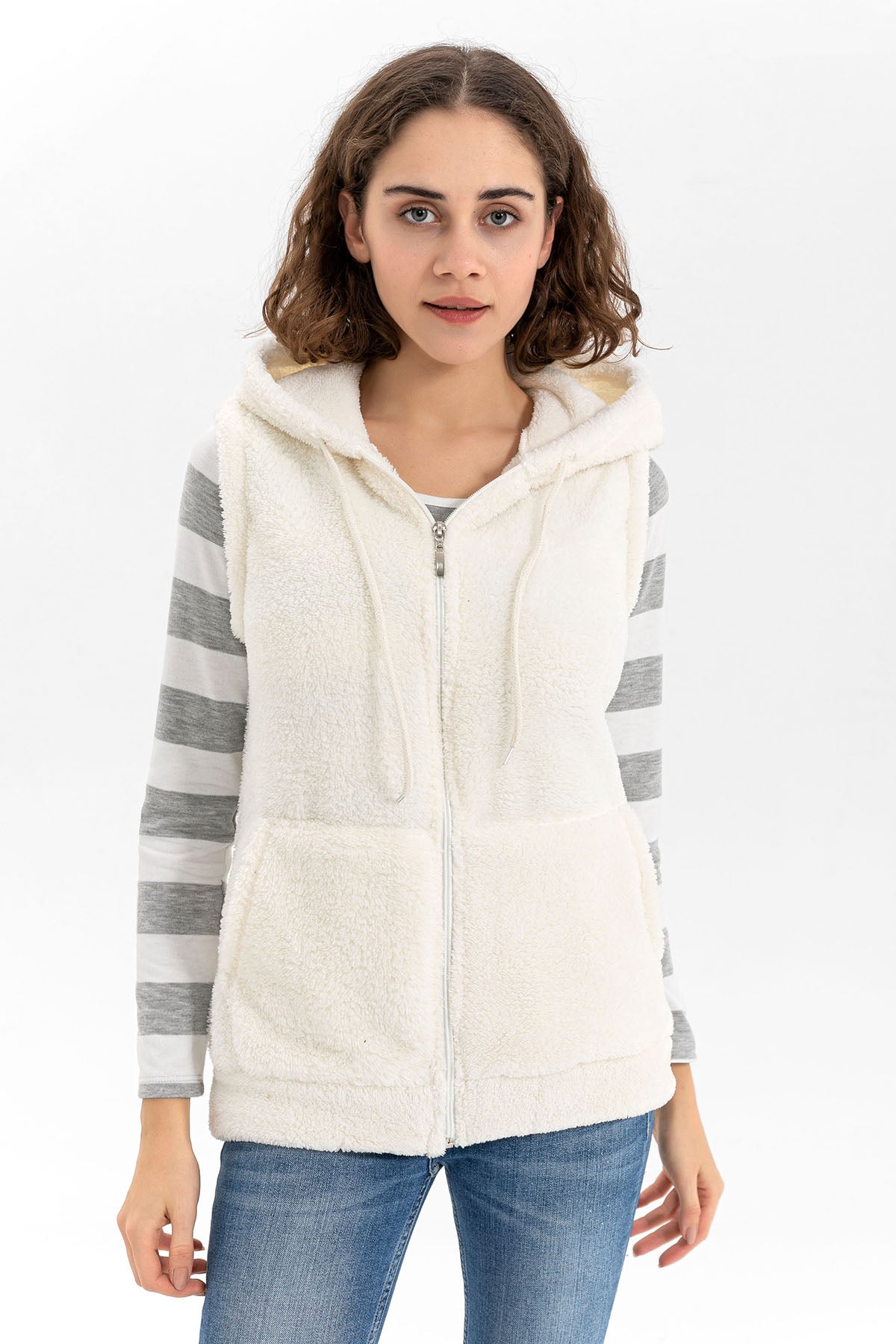 Kadın Ekru Kapşonlu Kolsuz Peluş Yelek