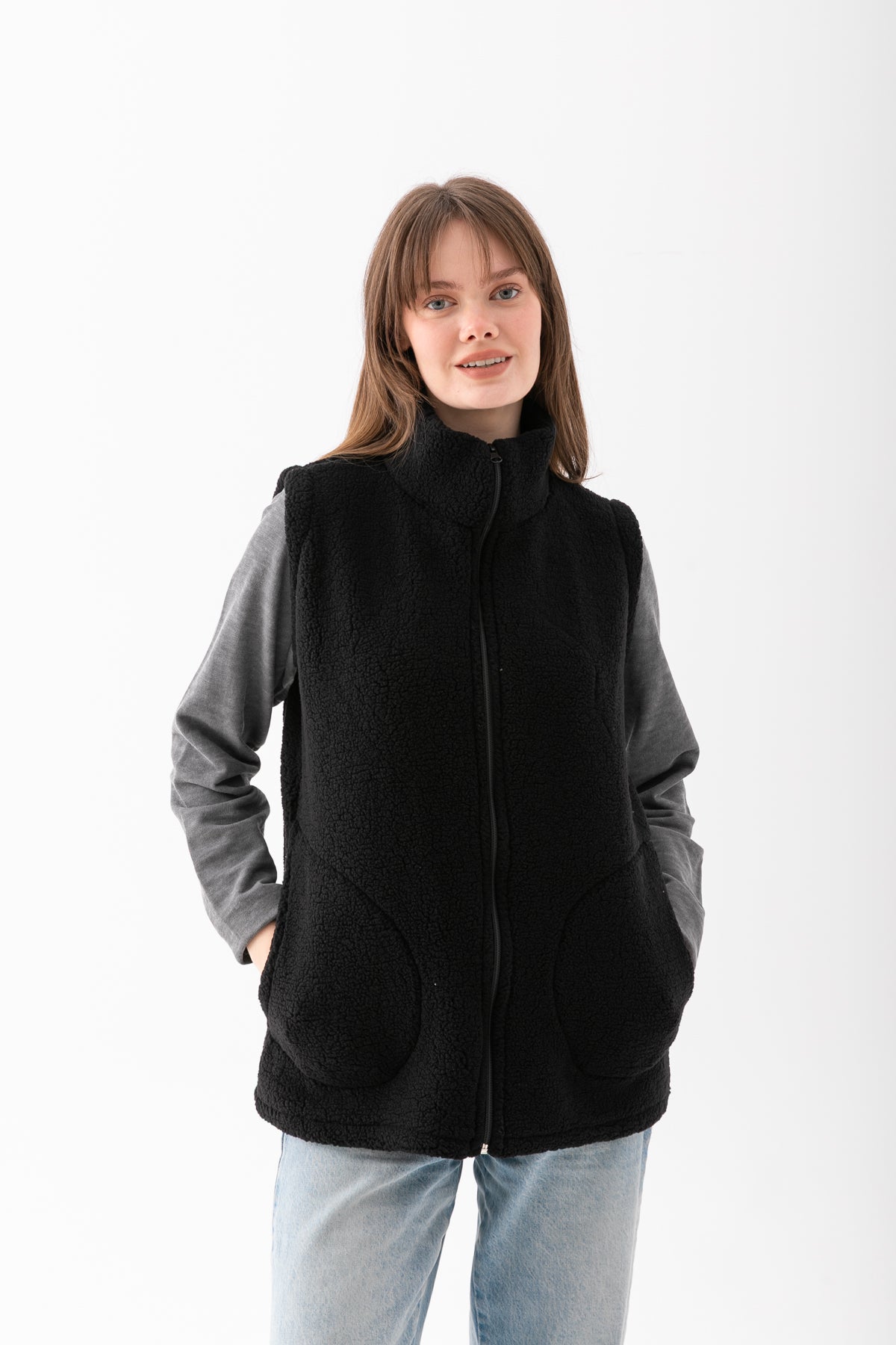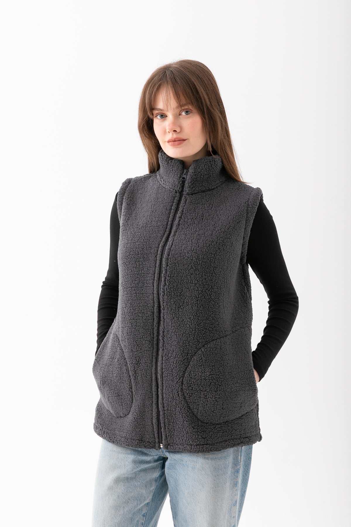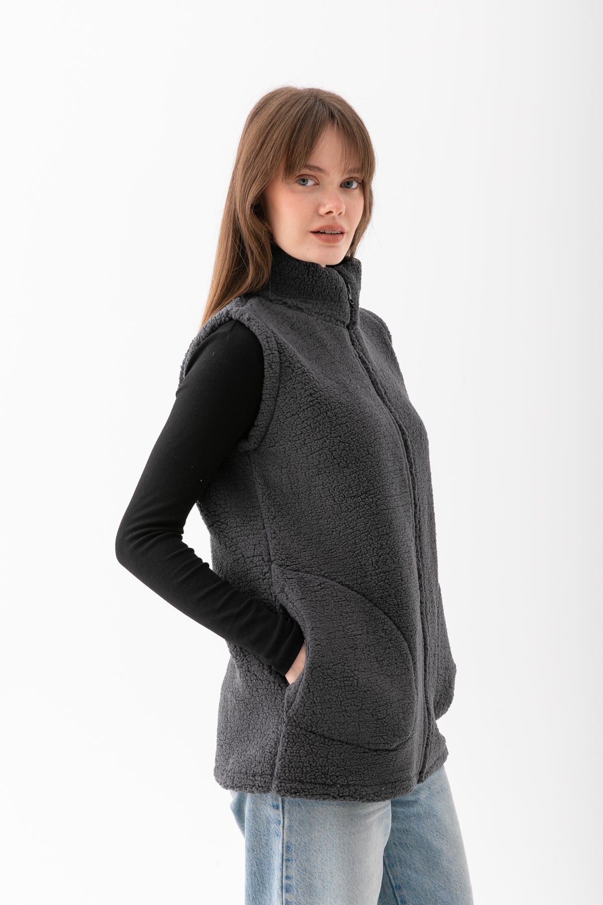 Kadın Koyu Krem Kapşonlu Kolsuz Peluş Yelek