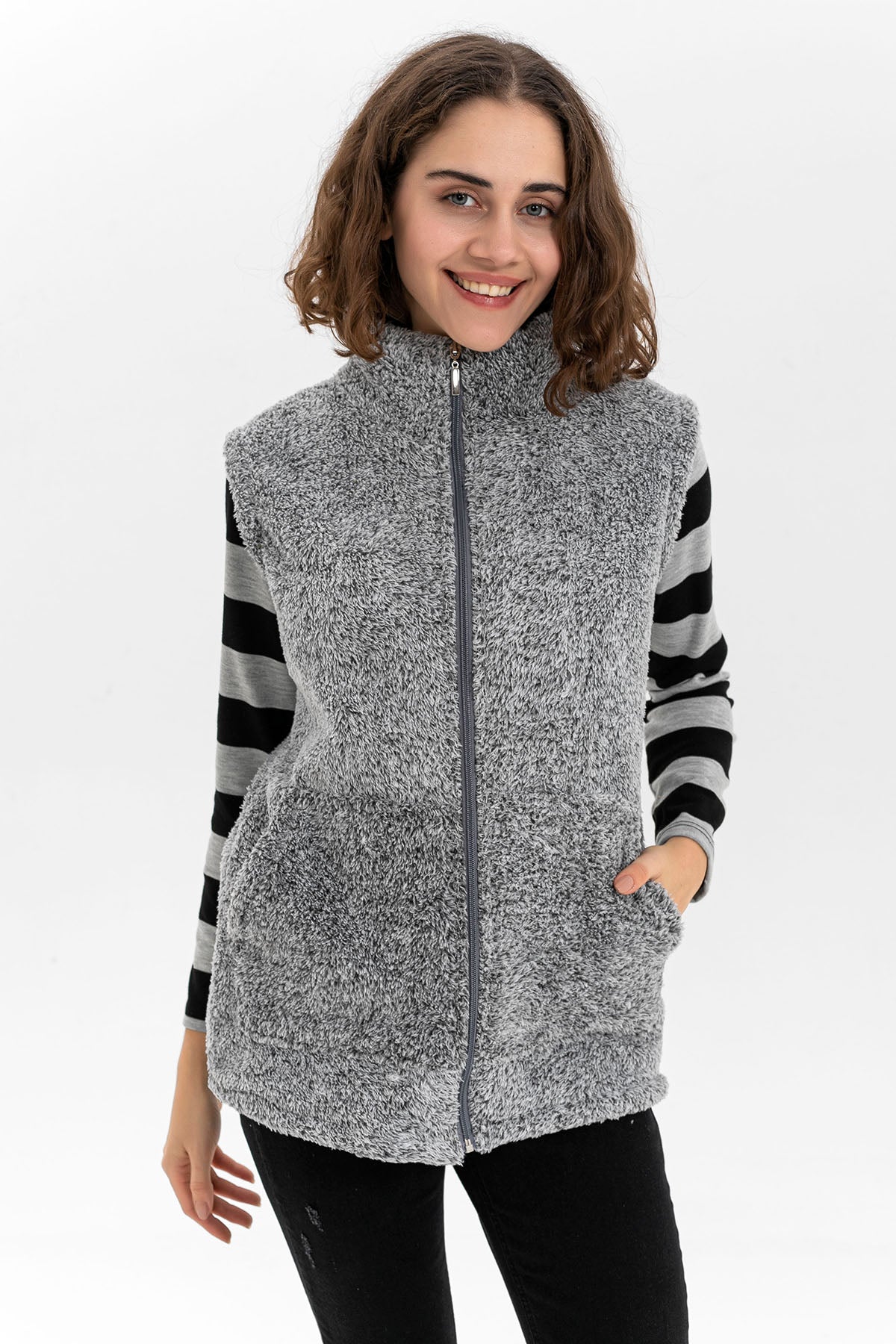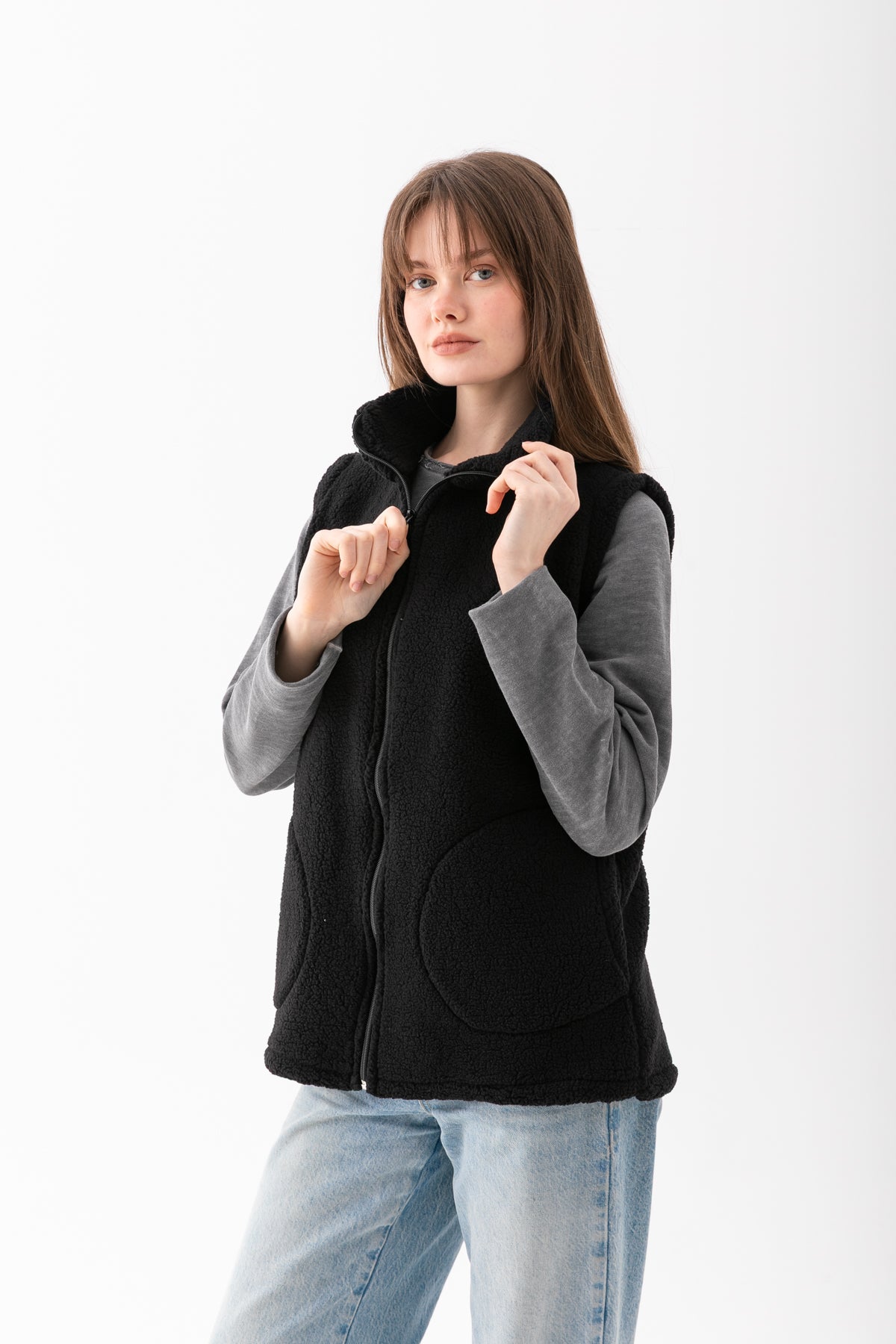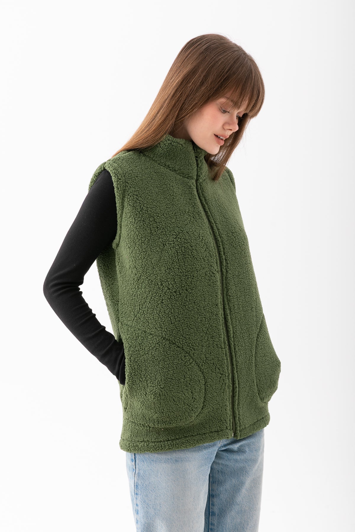 Kadın Koyu Krem Kapşonlu Kolsuz Peluş Yelek