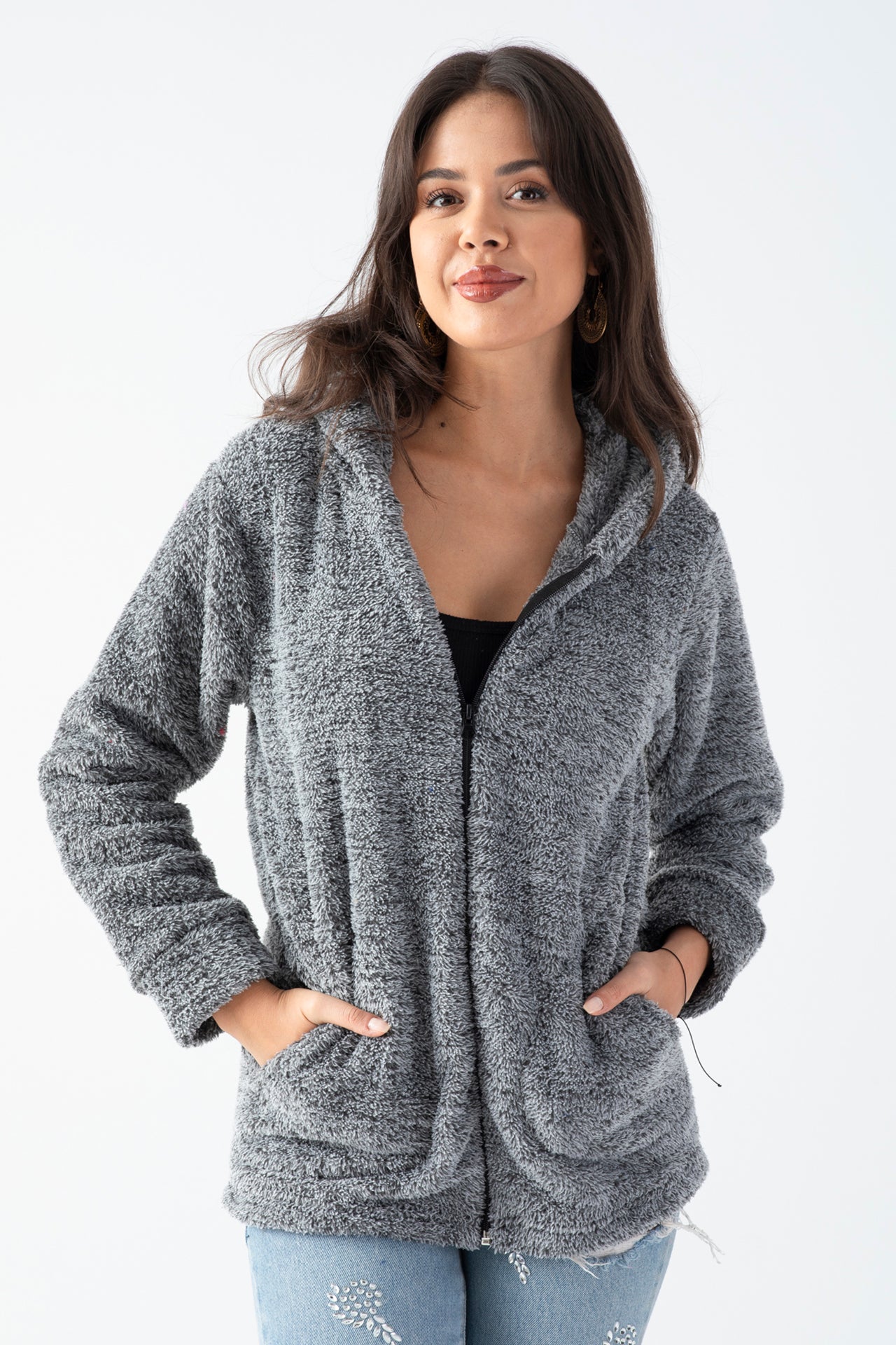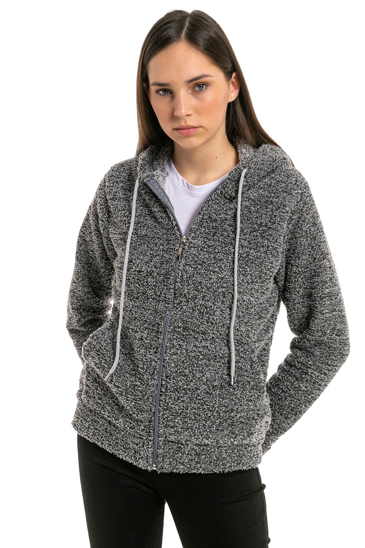 Kadın Gri Uzun Kollu Kopüşonlu Peluş Ceket