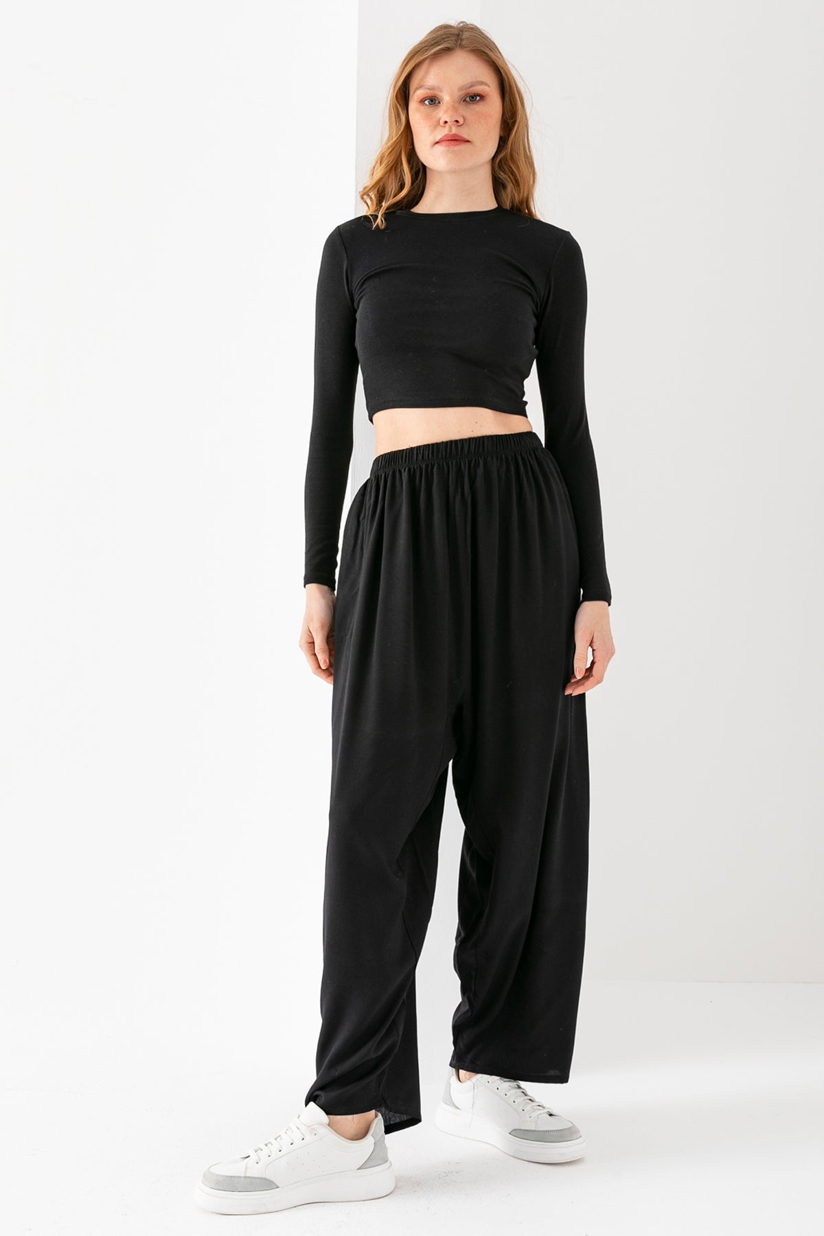 Kadın Siyah Şifon Detaylı Paçası Lastikli Şalvar Pantolon