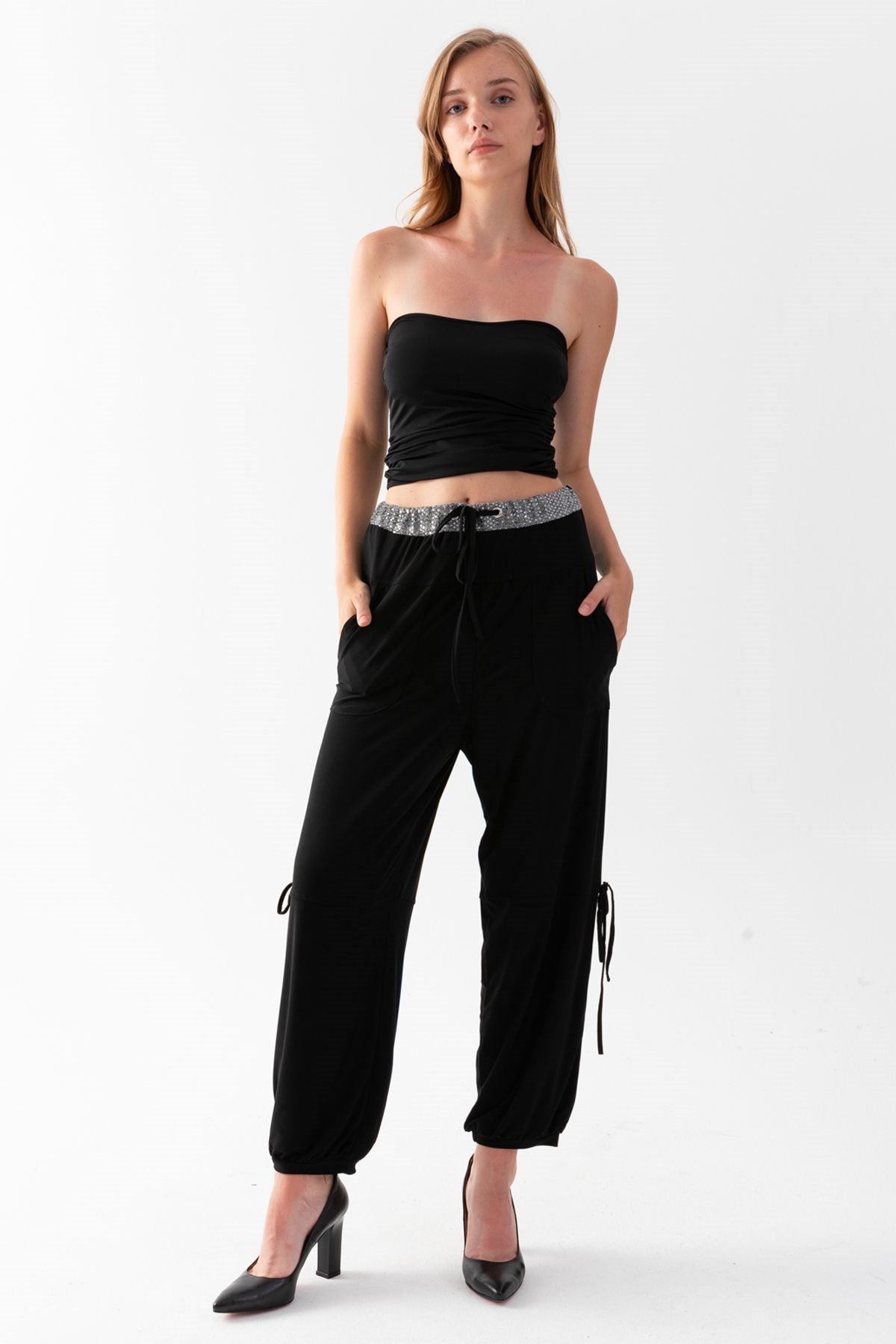 Kadın Siyah Beli Parıltı Detaylı Paçaları Manşetli Jarse Şalvar Pantolon