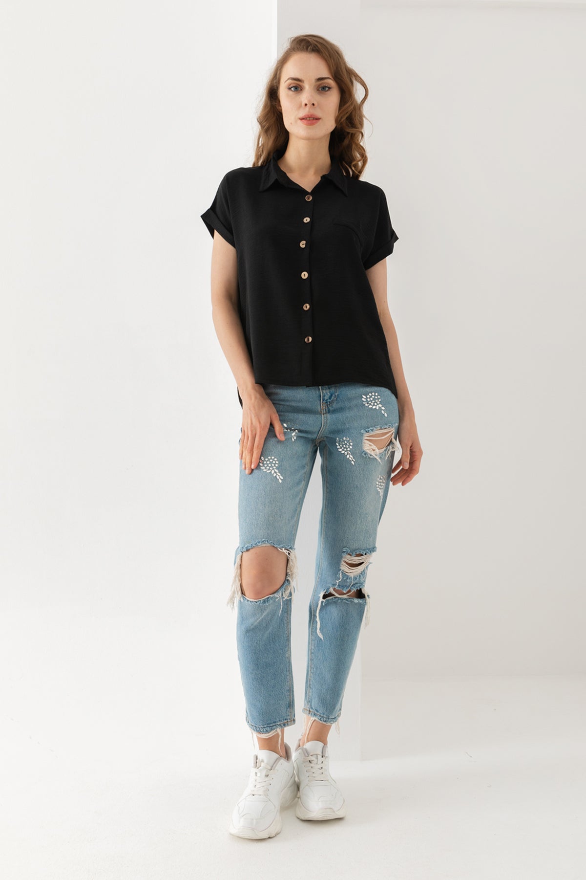 Kadın Siyah Kolları Pul Güpürlü Bluz